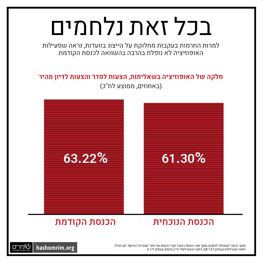 מי המפלגות שבאות לעבוד באופוזיציה - ומי לא? ומה לגבי המפלגות החברות בקואליציה? מה משותף לח"כ גלית דיסטל אטבריאן ולח"כ עופר כסיף? איך קפץ ח"כ סמי אבו שחאדה לפסגת שיאני השאילתות? האם החרמות של הליכוד מצמצמים את עבודת האופוזיציה? ואיזו מתנה מעניק ח"כ עמיחי שיקלי לסיעת ימינה? מאגר חברות וחברי הכנסת של שומרים - הניתוח התקופתי