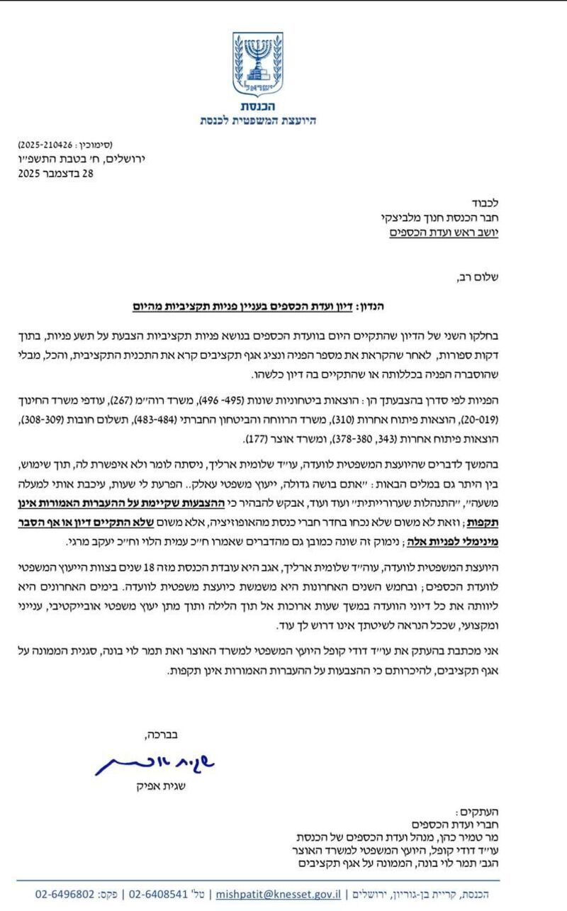 שומרים הצביע על התופעה הזו כבר בפברואר 2023, כשהייתה עוד בחיתוליה, כמו גם לגיבוי המוגבל שמעניקה היועצת המשפטית של הכנסת עו"ד שגית אפיק לבכירי עובדיה הפזורים בוועדות. במקרה של ארליך, בת טיפוחיה של אפיק, מהימים ששימשה כעוזרת שלה בוועדת הכספים, שלחה יועמ"שית הכנסת מכתב למילביצקי שבו היא מודיעה לו כי תשע ההצבעות שהתקיימו באותה ישיבה ללא דיון, פסולות והעברות הכספים אינן בתוקף, אבל אמירות ברורות יותר שדורשות להפסיק את הפגיעה בעובדיה לא נשמעו במכתב.