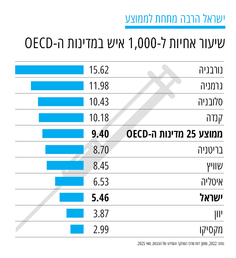 לפי נתוני משרד הבריאות, בישראל מספר המיטות לאלף איש נמוך באופן משמעותי מהממוצע במדינות המפותחת - 2.1 מיטות לאלף איש לעומת 3.5 ב-OECD. הפער הזה הוא כנראה גם אחד ההסברים המרכזיים לפער במספר האחיות לאלף איש כפי שנמדד ב-2022 - 5.6 בישראל לעומת 9.9 בממוצע במדינות ה-OECD. יחס הרופאים אגב משקף גם הוא תמונת עגומה, עם 1.6 לאלף איש בישראל לעומת 2.7 ב-OECD.