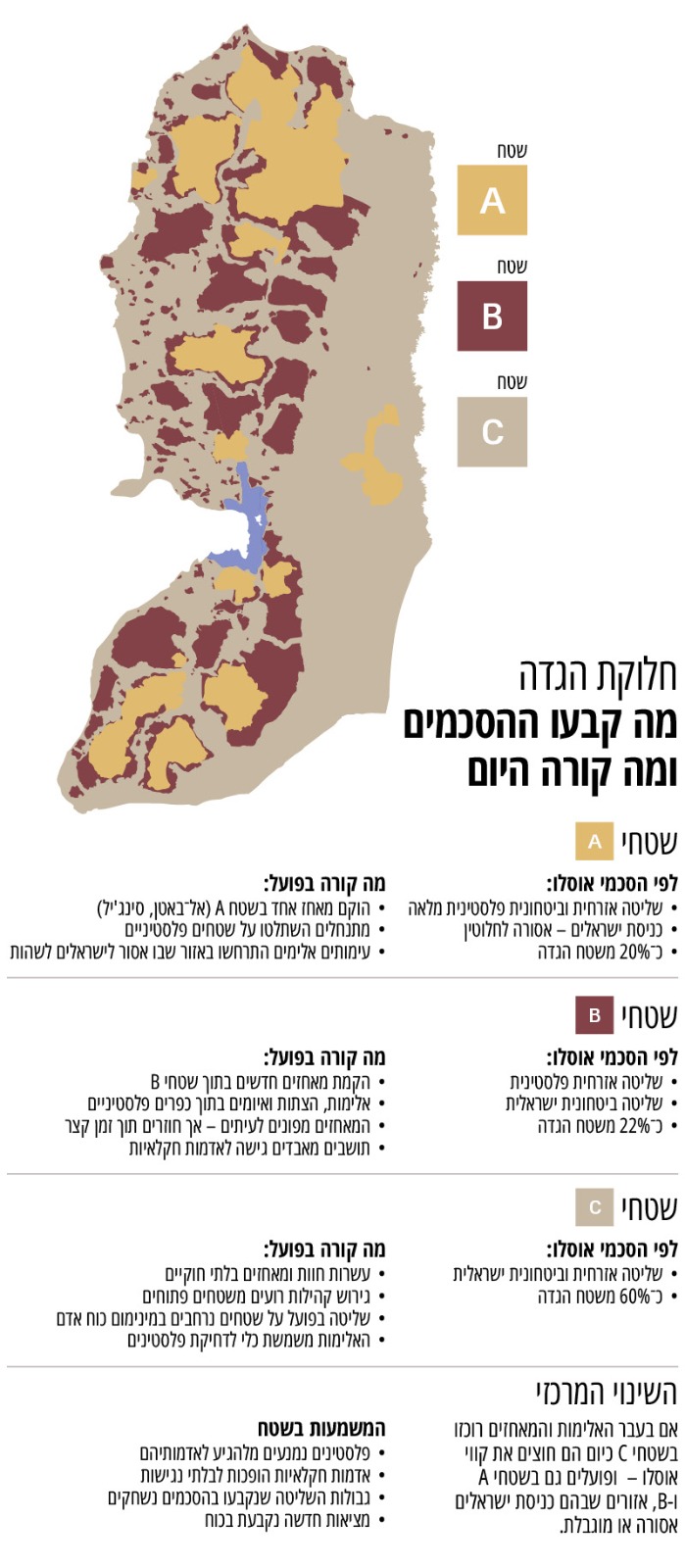 חלוקת הגדה לשטחי A, B ו-C נקבעה בהסכמי אוסלו. שטחי A, הכוללים בעיקר את הערים הפלסטיניות וכמה עיירות גדולות, מהווים מעט פחות מ-20% משטח הגדה, וכניסת ישראלים אליהם אסורה. הם נתונים לשליטה אזרחית וביטחונית פלסטינית. שטחי B, המהווים מעט יותר מחמישית מהגדה, כוללים מאות כפרים פלסטיניים ונמצאים בשליטה אזרחית פלסטינית אך תחת שליטה ביטחונית של צה"ל. שטחי C, כ-60% מהגדה, כוללים את רוב ההתנחלויות ונמצאים בשליטה ביטחונית ואזרחית ישראלית (ראו תרשים).